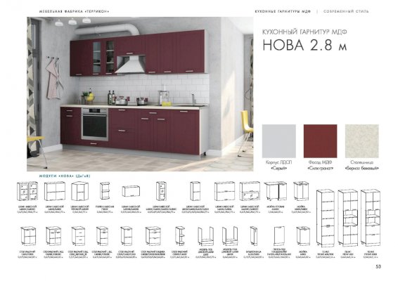 Кухня Нова изговаливается также в цветах серый/силк топаз; серый/силк гранат; серый/силк алмонд; серый/крем-брюле + горький шоколад глянец. Модули в этих цветовых решениях вы сможете найти в нашем интернет-магазине.
