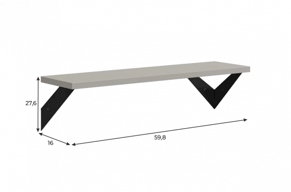 Полка крепится к стене с помощью чёрных треугольных держателей, которые обеспечивают устойчивость и долговечность. Особенность модели в том, что держатели можно расположить сверху, снизу или один сверху, другой снизу, что позволяет адаптировать полку под любые интерьерные решения и потребности.